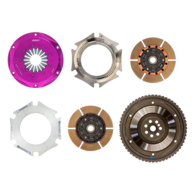 For high-powered applications, EXEDY offers twin and triple Multi-Plate clutches. These are designed for high power street action as well as drag, road and rally racing. The twin plate clutches are rated for approximately 500 ft/lbs of torque and the triple plates are rated for approximately 800 ft/lbs of torque, both figures at the flywheel. Twins come with both spring damper discs or solid discs depending on application, whereas triples are all solid discs and not recommended for street use.