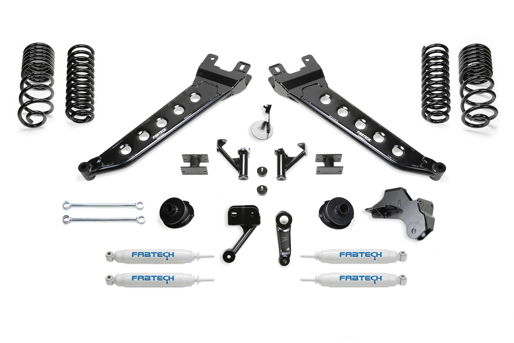 | Description_MKT | Improving on the Ram suspension design, Fabtech offers their trademark Radius Arms in a complete lift kit system. These exclusive tubular Radius Arms have recognizable dimple die side plates for superior strength and a signature of quality. The rugged Arms provide increased caster for use with oversized tires and lifted suspension heights. The factory front Ram coil spring has a noticeable bow to it with a very high spring rate for the weight rating of the vehicle. This creates a harsh ride with a nervous feel from the suspension. To correct this, Fabtech uses a straight vertical coil design. In order to utilize a straight coil, the lower spring seat mount must be modified via a Fabtech patented angular spring mount that attaches to the stock seat. This eliminates the bow to the spring and allows for a lower rate with a straight coil for a supple ride without sacrificing load carrying capacity. A Fabtech exclusive. For the rear, this lift kit has the perfect balance between ride quality and retaining the factory carrying capacity. By utilizing a dual rate spring design, it provides a good highway ride in the first stage of compression and then the second stage handles heavy loads. Heavy duty 1/4in thick steel front and rear Track Bar drop brackets center the axles under the vehicle with the new ride height. A Fabtech innovation with this Ram lift kit is the heavy duty steel front bump extensions. They retain the stock bump stop cushions for progressive damping and will not allow the suspension to over travel. This is a superior feature compared to replacement long length urethane bump stops as they can push out under harsh conditions. FEATURES: Fabtech's trademark Radius Arms with recognizable dimple die side plates providing additional strength and increased caster. Front straight Coil Springs with Fabtech's patented angled mounts for smooth ride. Heavy duty Track Bar drop brackets center the axles under vehicle for proper tracking. Dual rate rear coil spr |