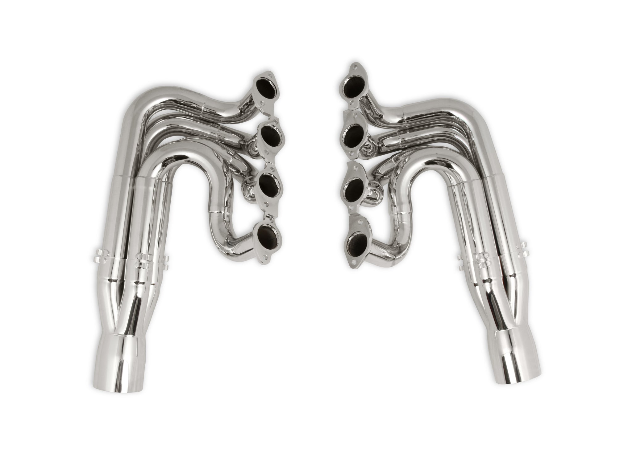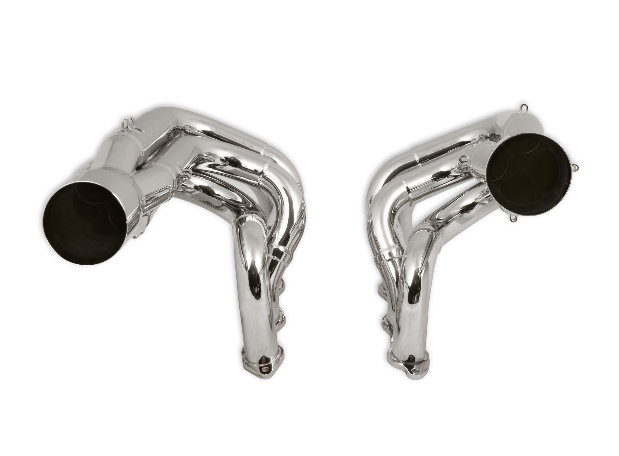 Hooker's RacingHeart Big Block Chevy Downswept, 3-Step Dragster Headers feature 2.125 inch/2.25 inch/2.375 inch stepped primary tubes to maximize exhaust flow, resulting in horsepower and torque gains over a broad rpm range. The 4.5 inch merge collector with merge spear design improves the transition of the exhaust pulse from the primary tube to the collector and maximizes the scavenging effect on the exhaust pulse. This helps maintain the velocity of the pulses as they travel through the collector. These headers are ideal for big block Chevy engines making over 1000 horsepower. They are available in both Chrome plated Mild Steel and Polished 304 Stainless Steel.