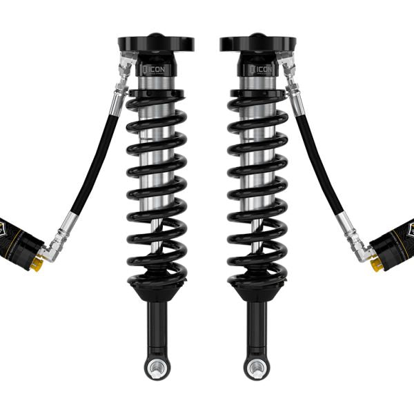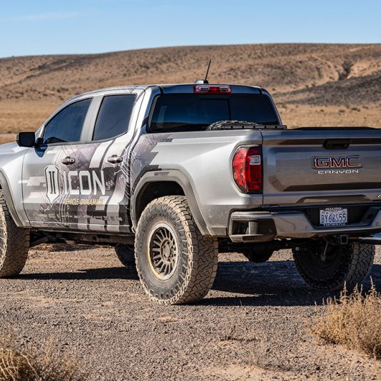 ICON Vehicle Dynamics V.S. Series 2.5” coilover shocks are an incredible upgrade for the front-end of 2023-2024 GMC Canyon and 2023-2024 Chevrolet Colorado Trail Boss and Colorado ZR2 trucks. Their longer length offers a 20% increase in total front wheel travel compared to stock, for a total of 10.25” of front wheel travel. ICON’s Vehicle-specific valving provides a sport tuned feel on and off-road while 1.75-2.5” of lift height adjustability allows the use of larger, more aggressive wheel and tire combinations. The larger 2.5” diameter shock body and increased piston area over stock components provides improved damping ability and outstanding ride characteristics across varying types of terrain. Remote reservoirs greatly increase shock oil volume and heat dissipation surface area to resist overheating and cavitation under hard use, which can lead to damper fade. ICON's exclusive Compression Damping Control Valves are included for precisely dialing in your suspension performance. CDCV controls fluid flow under compression, allowing you to achieve the perfect tune whether driving on the street, slow-crawling through the rocks or mobbing across the desert at full throttle. When paired with ICON rear 2.0 Aluminum Series or 2.5 Series shocks vehicle control will be balanced front to rear, resulting in the best overall driving experience for your GMC Canyon or Chevrolet Colorado Trail Boss and ZR2.