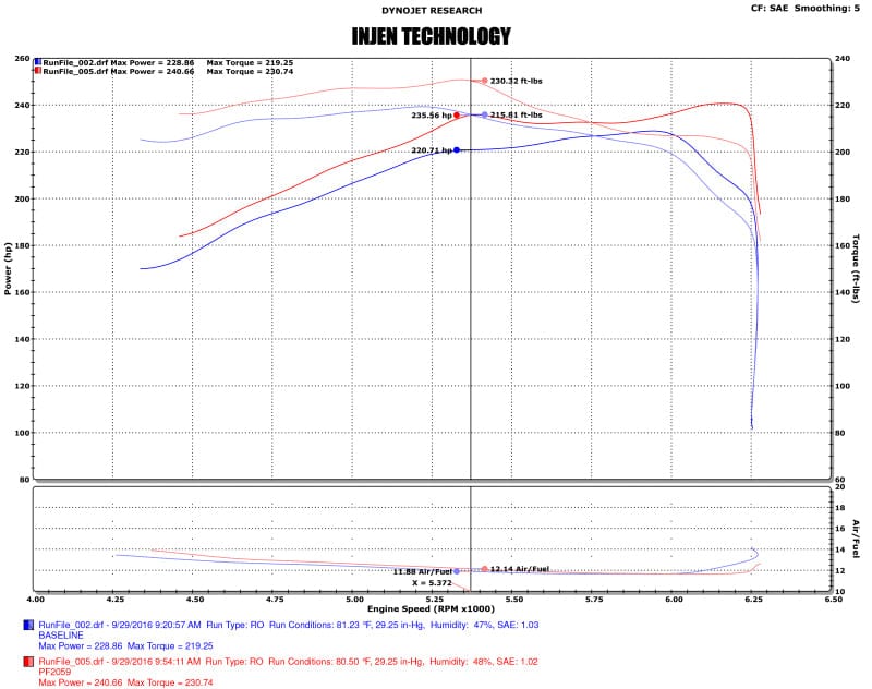 Injen is proud to introduce the newest Power Flow cold air intake to our line up. In recent testing PF2059P put out 14 hp and 14 lbs. of torque. This Power Flow intake is constructed out of 6061 Polished Aluminum to provide a clean style. All Injen Power Flow kits are mandrel bent to provide a smooth air track that allows for maximum air speed. Handling the filtration duties on the PF2059 is a large SuperNano-Web Dry air filter providing great flow and unbeatable filtration. The SuperNano-Web Dry air filter does not require any oil and is easy to clean. All Injen cold air intakes come complete with all required hardware to allow the customer to have a hassle-free and easy installation. Performance Air Filter: This intake system utilizes the Injen dry, SuperNano-Web conical high flow air filter that provides unbeatable protection as well as maximum performance. One-Piece Heat Shield: The sturdy 18 Gauge black Powder-Coated Heat Shield Helps to block out engine heat. This heat shield uses factory mounting locations to help provide a fast and simple installation. Mandrel-Bent Tubing: The 6061-T6 Aluminum Intake Tube is Mandrel-Bent to administer a less restrictive intake air path resulting in smoother airflow. Quality Hardware: Stainless Steel Band Clamps with inner protective liner and reinforced automotive grade silicone couplers are used to provide the most secure installation available. Dyno Results: After hours of design and dyno testing This Power Flow Air Intake system was providing good power racking up 14 additional horsepower and 14 lbs. of torque.