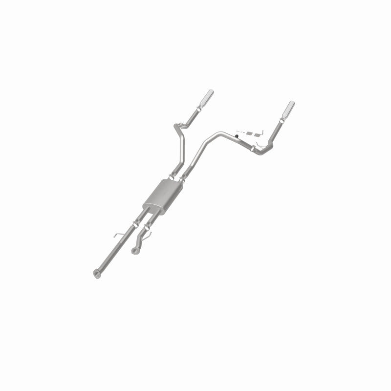 The MagnaFlow 2014-2021 Toyota Tundra Street Series Cat-Back Performance Exhaust System 15305 brings out the personality of your 4.6L, 5.7L 2014-2021 Toyota Tundra with our signature resonant, powerful engine tone and dyno-proven performance. Thanks to its fast-flowing, mandrel bent 2.5in. main piping and 1 Straight-Through mufflers ending in a Dual Split Rear exit with 3.5in. Polished Clamp-On Single Wall Angle Cut Rolled Edge tips, this Toyota Tundra exhaust kit has the performance chops to match its sporty sound and appearance. Upgrade your ride to the next level with an exhaust that has the pipes to put other Toyota Tundra's to shame. With this system your vehicle will be producing Aggressive exterior and Moderate interior sound levels while leaving other cars and trucks feeling envious at every stoplight. Exhaust kit 15305 features a cat-back layout that replaces your ride's stock exhaust components from near the catalytic converter on back. Extensive 3D scanning during development has resulted in a direct-fit design that you can easily install yourself. 15305 is produced using CNC precision robotic manufacturing techniques and is backed by MagnaFlow's 1-year limited finish warranty and limited lifetime construction warranty.