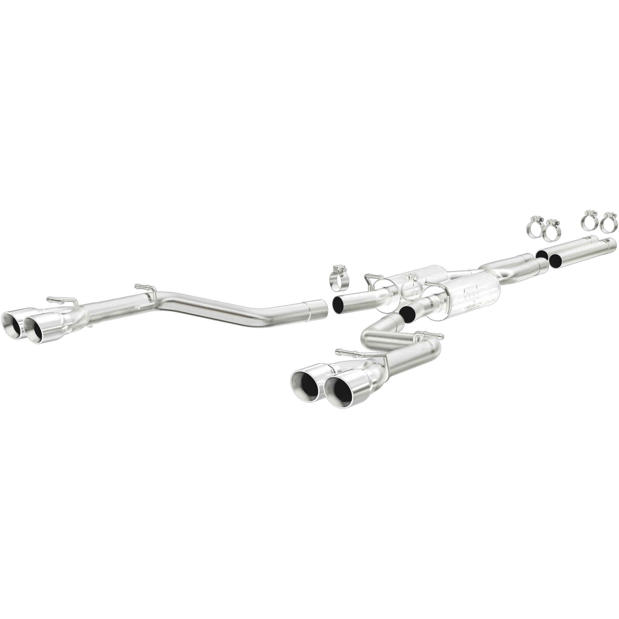 The MagnaFlow 2009-2014 Dodge Challenger Competition Series Cat-Back Performance Exhaust System 16515 brings an aggressive, attention-grabbing edge to the deep resonant exhaust note we're so well known for. This exhaust kit is designed to enhance your 5.7L 2009-2014 Dodge Challenger with dyno-proven performance made possible thanks to fast-flowing mandrel bent 2.5in. main piping and 2 Straight-Through mufflers ending in a Quad Split Rear exit with 3.5in. Polished Welded-On Double Wall Angle Cut Folded Edge tips featuring a sporty finish. The exhaust system's cat-back layout replaces your ride's exhaust system from near the catalytic converter on back. Exhaust system 16515 is engineered to make your vehicle's engine produce Agressive exterior and Moderate interior sound levels, befitting its competition-oriented design. 16515's direct-fit design makes installation a breeze thanks to the use of advanced 3D scanning techniques. This performance exhaust system is made of 100% durable and corrosion-resistant stainless steel and produced using CNC precision robotic manufacturing, all backed by MagnaFlow's limited lifetime warranty. Please check to ensure compliance with local noise regulations.