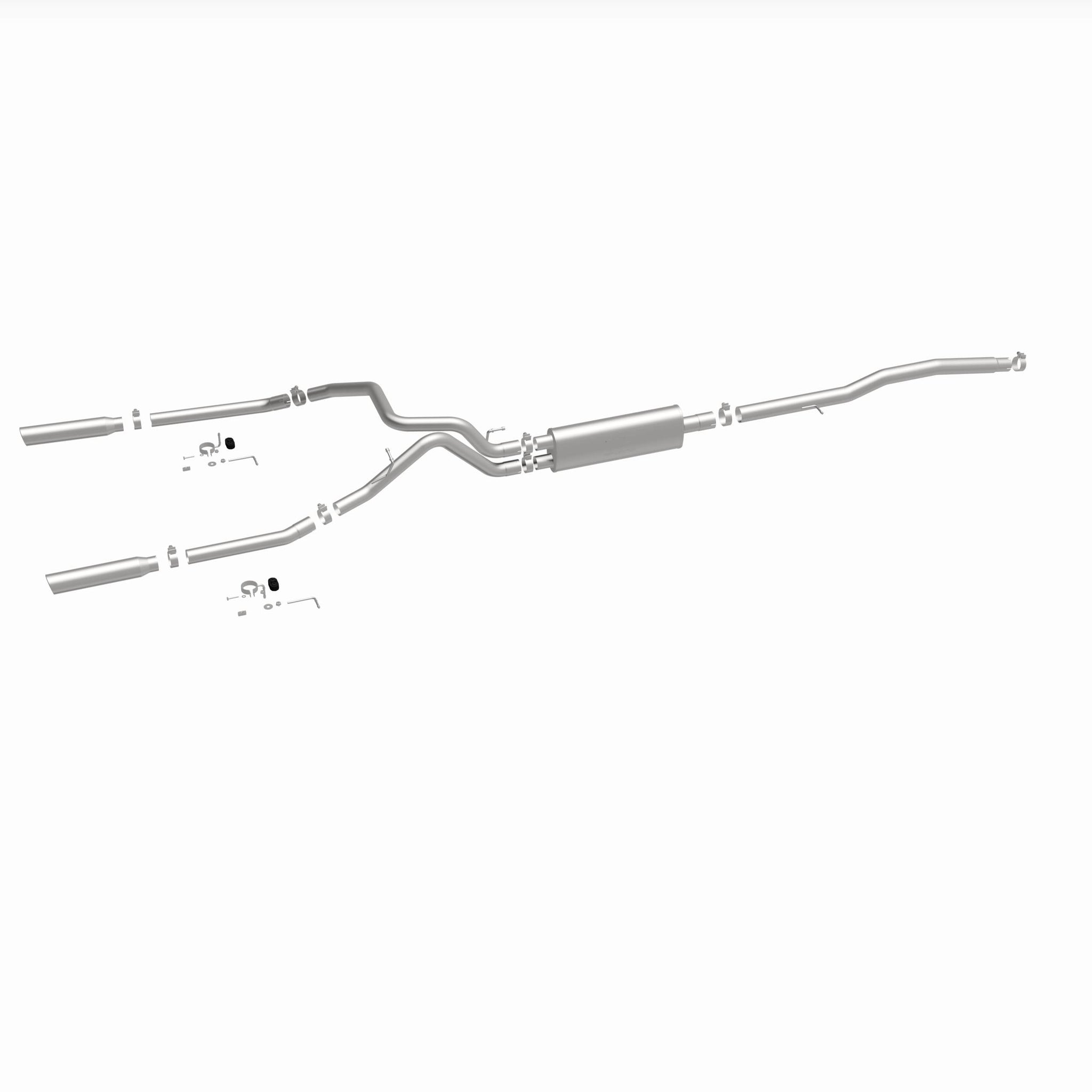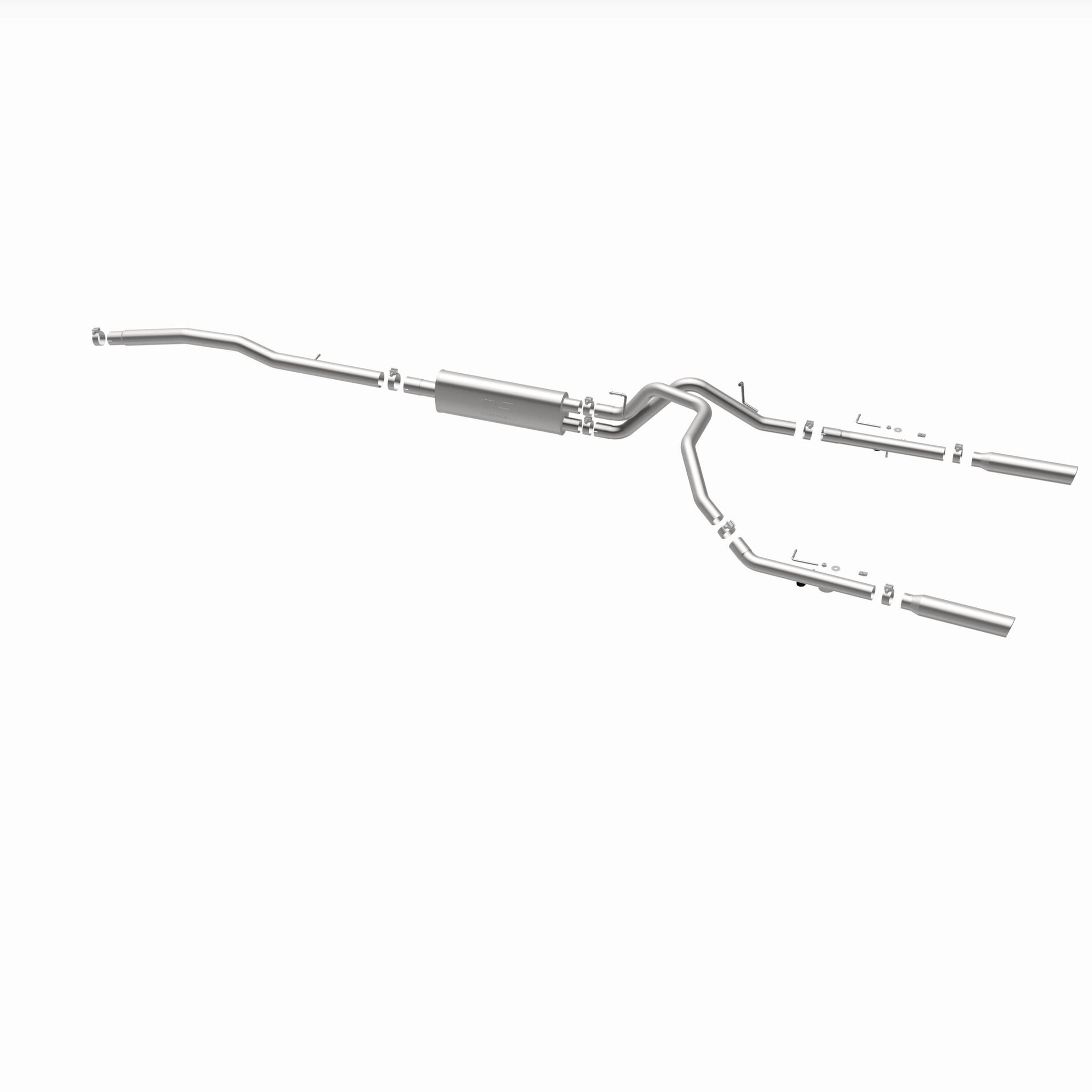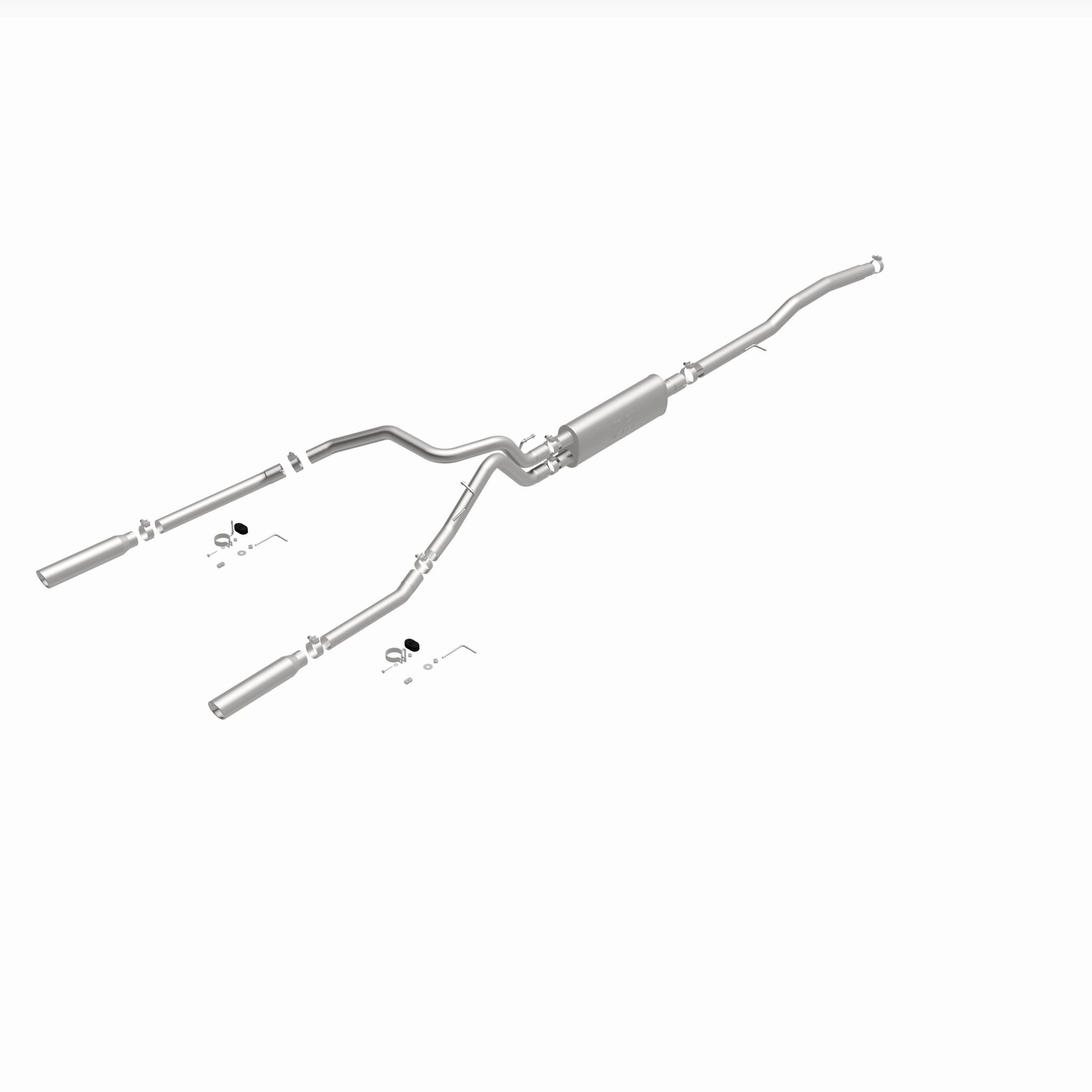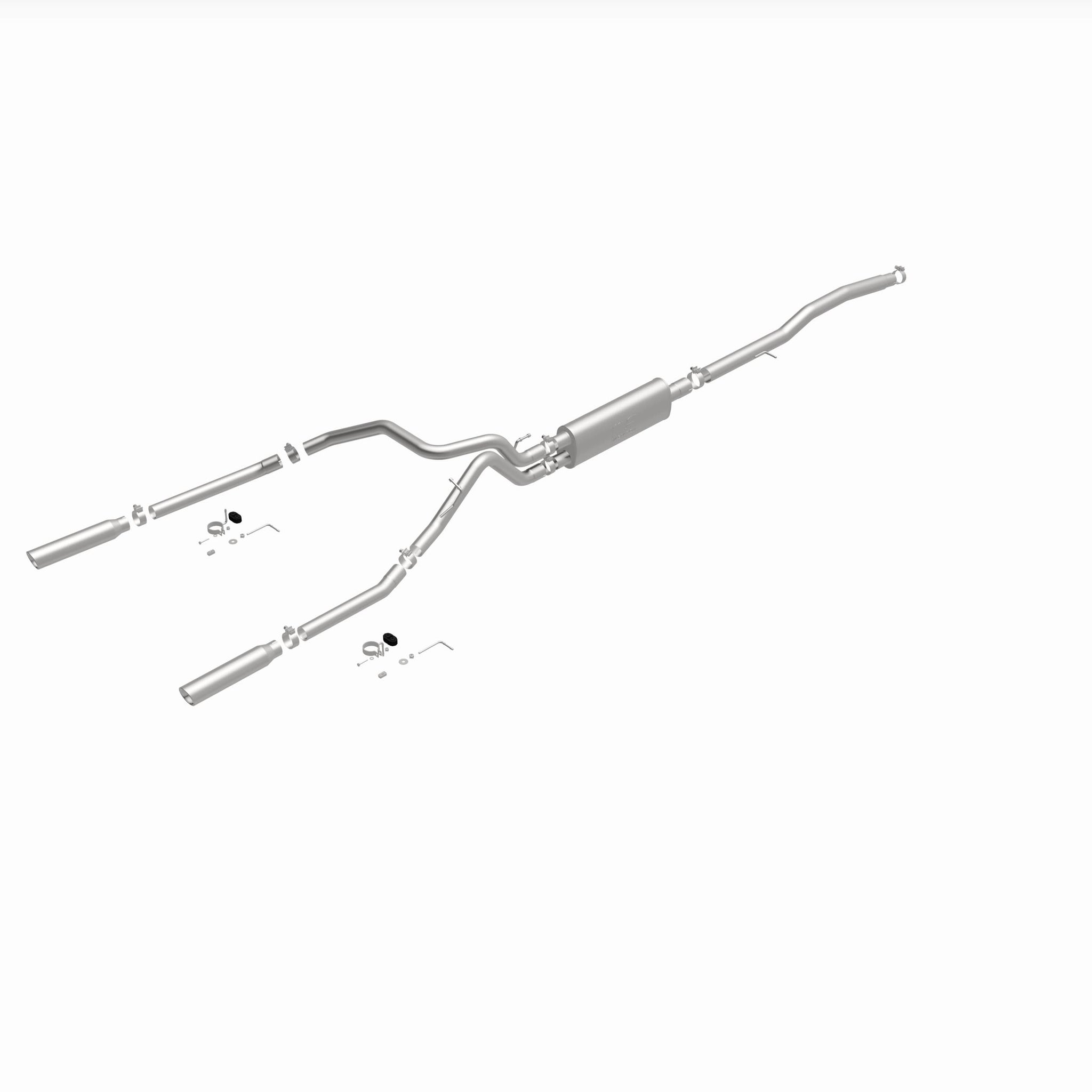 The MagnaFlow Street Series Cat-Back Performance Exhaust System 16622 brings out the personality of your Truck with our signature resonant, powerful engine tone and dyno-proven performance. Thanks to its fast-flowing, mandrel bent 3in. main piping and 1 Straight-Through mufflers ending in a Dual Split Rear exit with 3.5in. Polished Clamp-On Single Wall Angle Cut Rolled Edge tips, this Truck exhaust kit has the performance chops to match its sporty sound and appearance. Upgrade your ride to the next level with an exhaust that has the pipes to put other Truck's to shame. With this system your vehicle will be producing Aggressive exterior and Moderate interior sound levels while leaving other cars and trucks feeling envious at every stoplight. Exhaust kit 16622 features a cat-back layout that replaces your ride's stock exhaust components from near the catalytic converter on back. Extensive 3D scanning during development has resulted in a direct-fit design that you can easily install yourself. 16622 is produced using CNC precision robotic manufacturing techniques and is backed by MagnaFlow's 1-year limited finish warranty and limited lifetime construction warranty.