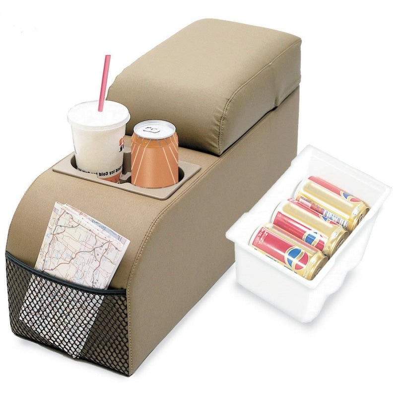Padded console has a contoured design to match seat. Includes a locking storage area which is fully lined, a padded arm rest and easy to install with minimal drilling. There is a cup holder for two, a recessed and removable 6 can cooler plus a front cargo net to store. A leveling bracket is included for secure fit.