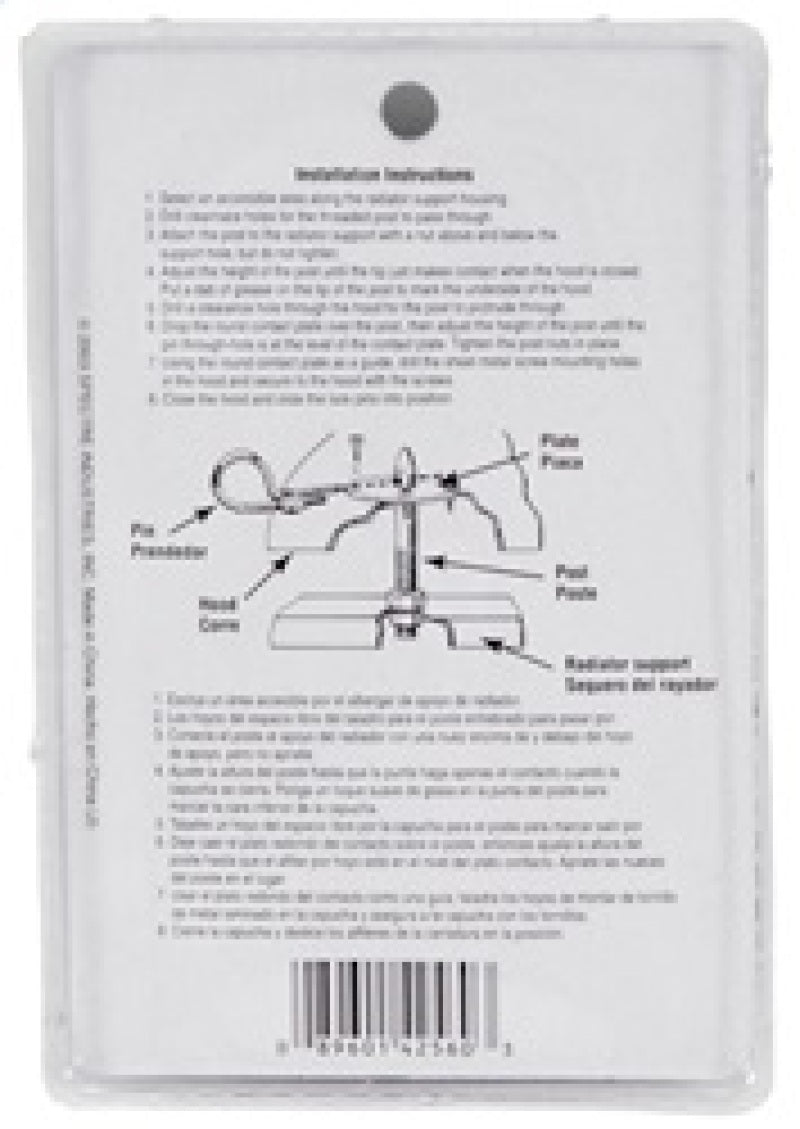 Spectre's chrome plated pin kit includes 2 posts, 2 scuff plates, 2 hair pin clips, 8 metal tap screws and 4 lock nuts. The components are made from triple chrome-plated steel. This is a universal kit to be used in conjunction with a normal hood latch, and while some drilling is required the kit includes easy to follow instructions.