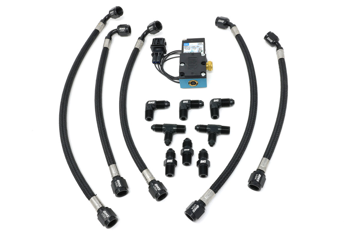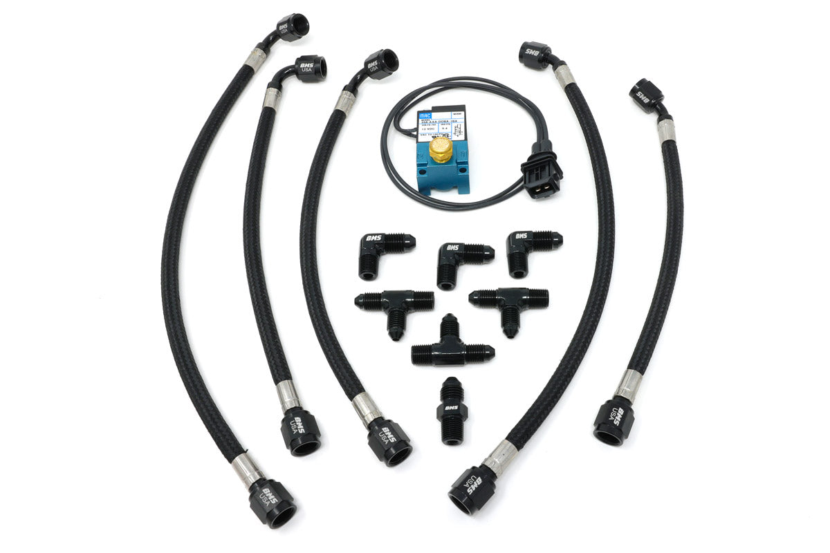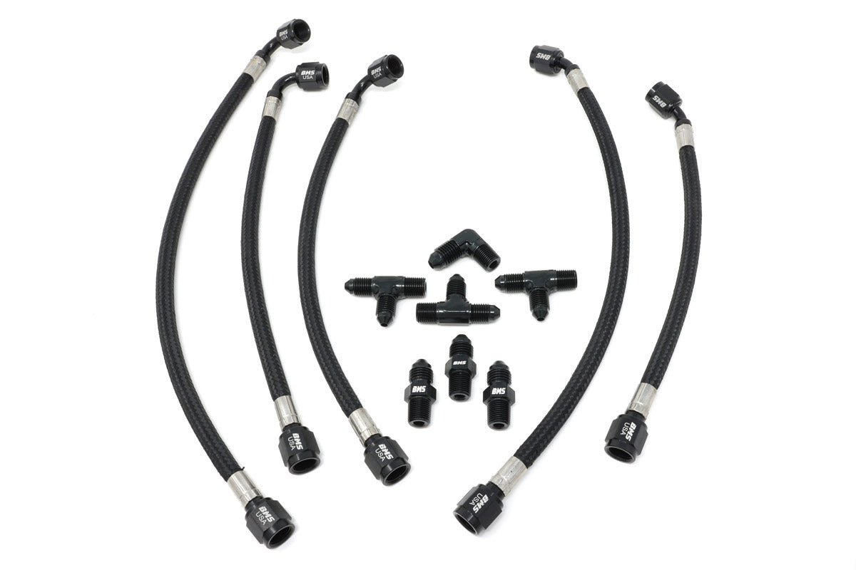 The prefect compliment for your external wastegate large turbo kit! These braided stainless lines not only fit and look great but dramatically increase engine safety and reduce the chances for a catastrophic over boost due to a melted or failed wastegate lines.