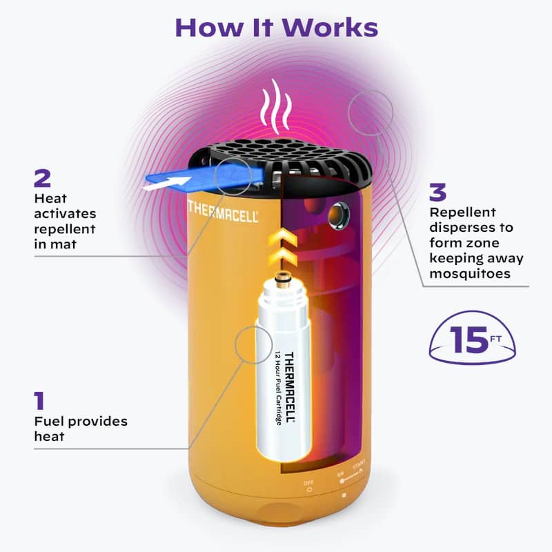 - Powered by a safe and compact fuel cartridge. Emits scent-free repellent that drives away mosquitoes.